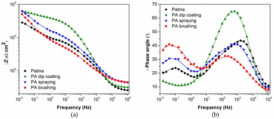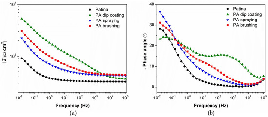 Electrochemical impedance spectroscopy measurements were conducted on samples with phosphonic acid films prepared by all three studied methods and dried at 80 °C since drying at lower temperatures did not result in satisfactory film properties. The Bode plot of the EIS results obtained on the first day of immersion is shown in Figure 2. From the impedance modulus plot (Figure 2a), it can be seen that the phosphonic acid films obtained by all three methods improved the corrosion resistance of the patinated bronze. After two weeks (Figure 3), the corrosion resistance of the bare patina and PA-treated patina increased, followed by a change in the phase angle plot. As the shape of the phase angle curve of bare and protected patinated bronze is changed in a quite similar way, it can be assumed that this is mainly the result of the transformations of the patina layer.