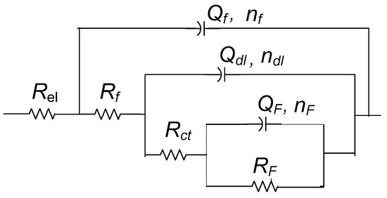 Equivalent electrical circuit used for fitting the impedance data in Figure 6.