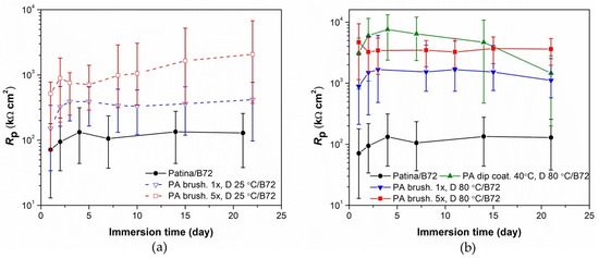 Polarization resistance as a function of immersion time in simulated acid rain for the patinated bronze samples coated with Paraloid B-72 alone or pretreated with (a) PA dried at room temperature and (b) PA dried at 80 °C.