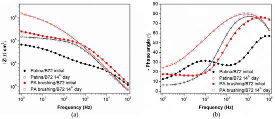 EIS—Bode plots for Paraloid B-72 and PA brushing 5×, D 80 °C /Paraloid B-72 protected patina measured first and 14th day of immersion: (a) impedance modulus, (b) phase angle. Symbols: experimental data; solid lines: modeled data according to electrical equivalent circuits given in Figure 7.
