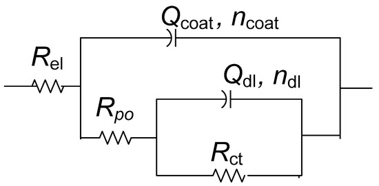 In addition to polarization measurements, samples coated with Paraloid B–72 alone or combined with PA 5×, D 80 °C brushing pretreatment (the best result in Figure 5) were also characterized by electrochemical impedance spectroscopy (Figure 6). The EIS measurements were conducted in the frequency range from 100 kHz–10 mHz. The low-frequency region (1 Hz–10 mHz) exhibited a shape characteristic of diffusion impedance in pores, but it was difficult to determine the impedance parameters for this region unambiguously. Therefore, the EIS spectra in the frequency range from 100 kHz–1 Hz were examined by fitting to an electrical equivalent circuit model with two-time constants presented in Figure 7. Such a model is typically observed for coated surfaces, where Rpo represents the resistance of the ionically conducting paths across the coating (“pores”) and Qcoat represents the capacitance of the coating [28]. Rct − Qdl couple represents the corrosion reaction at the metal substrate/solution interface, as described previously.