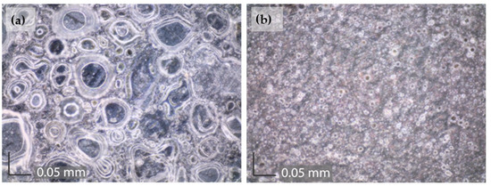The Paraloid B-72 coated samples, with or without the PA brushing (5×, D80 °C) pretreatment, were also exposed to the humidity corrosion test chamber with NO2. After two weeks of exposure, the samples were examined with an optical microscope at a magnification of 740× (Figure 9). The sample to which PA was applied showed significantly fewer defects in the coating. In the sample where the coating was applied directly to the patina, it is clearly visible that the entire coating is cracked. The obtained images are consistent with the SEM images obtained after exposure of the samples to acid rain solution and with results obtained with electrochemical measurements showing the beneficial effect of PA pretreatment on Paraloid B-72 protective properties.