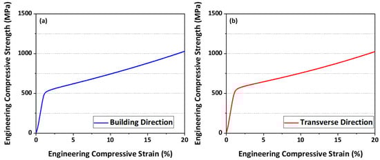 Room temperature engineering stress-strain curves obtained from the quasi-static compression tests in (a) building direction and (b) transverse direction.