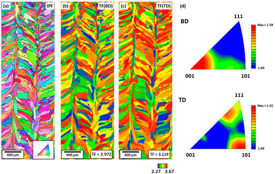 Figure 4c depicts a map showing the resulting Taylor factor distribution when deformation is applied along the BD in the same regions in Figure 4a,b. The slip plane and slip direction were set to (111)<110>, which is the main slip system of FCC materials. Figure 4d shows the TF distribution map, which shows the correlation between Figure 4a,c, calculated through EBSD when deformed in the BD direction. In Figure 4d, the <111> oriented grain and <011> oriented grain have a high Taylor factor, whereas the <001> oriented grain have a relatively low Taylor factor []. Thus, the close relationship between the grain orientation and Taylor factor is highlighted.