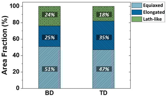 The area fraction of each cellular structure morphology was measured from 50 SEM micrographs of the TD and BD plane using an image analyzer, respectively (Figure 7). In the TD planes, the fraction increases in the order of lath-like (18%), elongated (35%), and equiaxed (47%) whereas in the BD planes, the fraction increases in order of lath-like (24%), elongated (25%) and equiaxed (51%). In both planes, the cellular structure area fraction tends to be similar, but the area fraction values are different. TD plane has high area fraction of elongated type with a high Taylor factor and hardness, whereas BD plane has high area fraction of equiaxed type with a low Taylor factor and hardness. This is consistent with the tendency that the yield strength in the TD direction is higher than that in the BD direction.