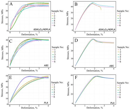 Figure 2A–F shows the static tensile test results of the filaments and samples printed from ABS, PLA, and polymer-ceramic filaments.