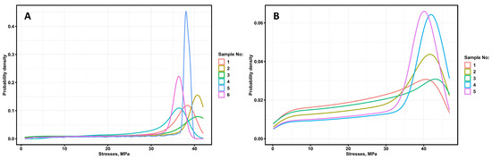 Figure 4 shows the behavior of the stress probability density when testing filament specimens and printed 60Al2O3/40PLA samples, corresponding to the diagrams in Figure 1A,B.