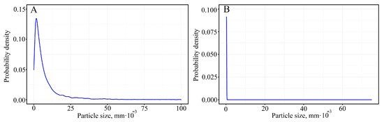 Probability density function of alumina particle size distribution in 3D printed 60Al2O3/40PLA sample 1 (A) and 2 (B).