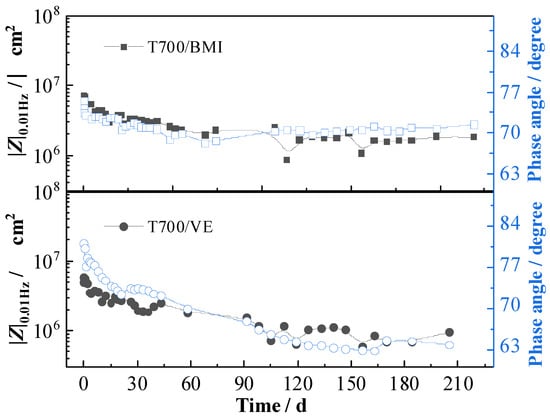 3.1. EIS Spectra of T700/VE Composite in 3.5% NaCl Solution
