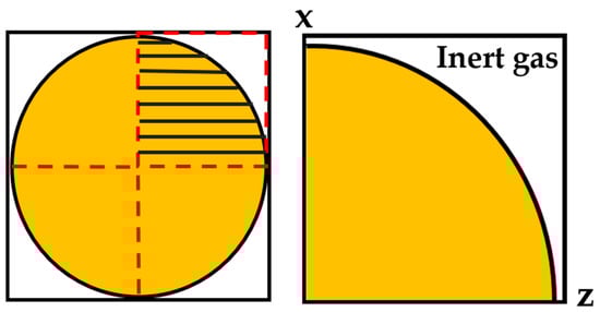 The grid spacing was set to ∆x = 0.02 µm, which was a compromise between resolution and calculation time in such a way that changes in grid spacing no longer significantly affected the simulation results. A two-dimensional simulation domain (circle shaped) was used instead of a three-dimensional spherical model as it offers results with sufficient accuracy, e.g., high spatial resolution with reasonably short calculation times. Only a quarter of a circle was used for simulation because of the symmetrical characteristic of the droplet, as demonstrated in Figure 1. There were a total of 504 cells in the X and Z directions, and the number of cells in the Y direction was set to 1 as it is a 2D simulation. The thickness of the diffuse interface was set to 0.08 µm (four grid cells).