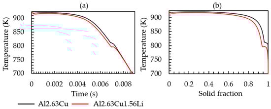 (a) Time-temperature cooling curve; (b) solid fraction-temperature curve of the Al-2.63Cu and Al-2.63Cu-1.56Li alloys for a constant heat extraction rate of 1.53 × 105 Js−1cm−3.