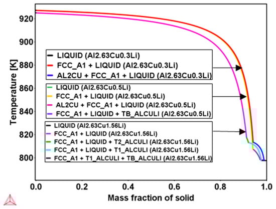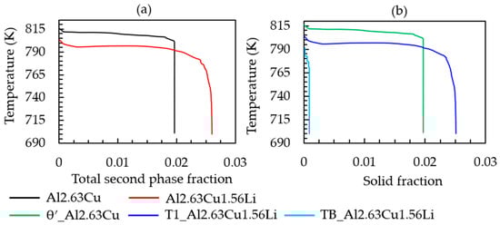 The simulated cooling curve for the heat extraction rate given in Table 2 and the corresponding solid fraction formation of both Al-2.63Cu and Al-2.63Cu-1.56Li are presented in Figure 2a,b, respectively. It can be seen in Figure 2a that addition of 1.56 wt.% of lithium into Al-2.63Cu led only to a slight decrease in the onset of solidification by nucleation of the primary FCC phase from 920 °C to 918 °C. The eutectic reaction also started at a lower temperature, 805 °C for Al-2.63Cu-1.56Li, compared with 815 °C for Al-2.63Cu. Additionally, the total amount of secondary phases in Al-2.63Cu-1.56Li was increased from approximately 2 to 2.5 wt.% compared with Al-2.63Cu, as shown in Figure 3a. There was only one secondary phase, θʹ (Al2Cu), in Al-2.63Cu, whereas two secondary phases were formed in Al-2.63Cu-1.56Li alloy, namely T1 and TB (see Figure 3b). The decrease in nucleation temperature of the secondary phases when adding Li to the binary Al-2.63Cu can be seen directly in Figure 3b.