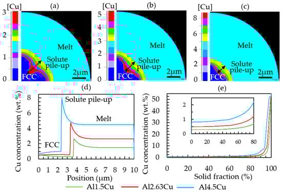 As an example, Al–Cu with different copper contents was simulated. The copper pileup ahead of the interface increased with increasing Cu concentration in the alloy, see Figure 5. The snapshots in Figure 5a–c were taken at the same time, showing the effect of the Cu content on the growth dynamics as well. The red color in Figure 5a–c indicates the solute pileup regions with the highest copper concentration (e.g., approximately 3 wt.% Cu in Al-1.5Cu, 5 wt.% Cu in Al-2.63Cu, and 8 wt.% Cu in Al-4.5Cu), while dark blue and light blue represent FCC region and melt (1.5 wt.% Cu in Al-1.5Cu, 2.63 wt.% Cu in Al-2.63Cu, and 4.5 wt.% Cu in Al-4.5Cu), respectively. The copper concentration profiles in Figure 5a–c are also represented by the graph in Figure 5d. The graph in Figure 5e gives a sorted representation of the Cu concentration per computation grid cell, a common method to analyze the microsegregation [41,42]. In the simulation settings, the position of the FCC nucleus is predefined in the lower left corner of the simulation domain to respect the symmetry. In reality, nucleation is expected to take place at the surface rather than in the center. However, for a statistical investigation of the segregation, the position was not that relevant; more important were the length scales, i.e., dendrite arm spacing and cooling rate. As it is later discussed, the length scales of the simulation and experiment are comparable. The outward-growing dendrite leads to a Cu accumulation between the main branches (interdendritic region) and at the particle surface, which then exhibits the eutectic areas. In Figure 5e, the graph shows that copper concentration dissolves in the primary FCC matrix in Al-1.5Cu is 0.3 wt.%. It further increases to 0.5 wt.% and 0.8 wt.% with increasing nominal copper content in Al-2.63Cu and Al-4.5Cu, respectively.