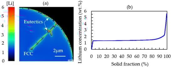 When taking a closer look at the concentration gradient of lithium atoms in Figure 8a, a depletion of lithium (dark blue spots) can be found between the secondary phases in the interdendritic regions and the FCC matrix.