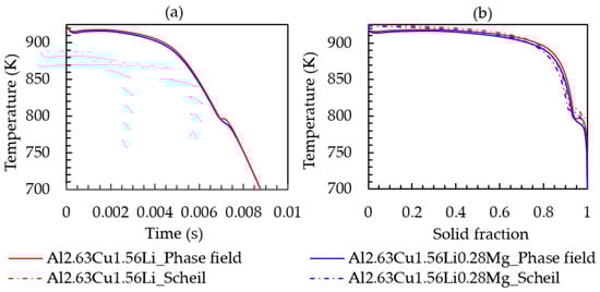 To study the effect of Mg on the solidification behavior, phase field simulations with Al-2.63Cu-1.56Li-0.28Mg were performed in the identical simulation setting as before. Figure 10 presents the cooling curve and solid-fraction formation. The addition of 0.28 wt.% Mg did not significantly affect the melting temperature, nucleation temperature of the primary phase, solid fraction, and solidification range, unlike the lithium addition into Al-2.63Cu alloy. T1 temperature and fraction formation over time are presented in Figure 11a,b, respectively, showing that the nucleation temperature is not affected by magnesium addition. However, the T1 solid fraction increased slightly from 0.025% to 0.028%.