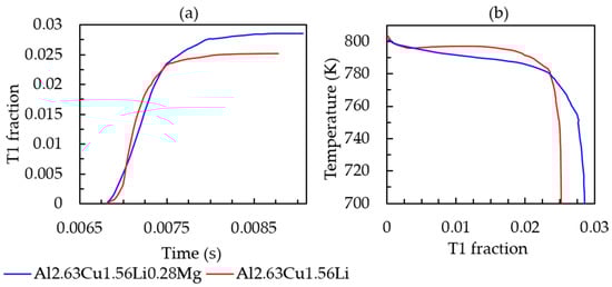 (a) T1 fraction versus simulation time. (b) T1 fraction versus temperature for Al-2.63Cu-1.56Li and Al-2.63Cu-1.56Li-0.28Mg droplet solidification.