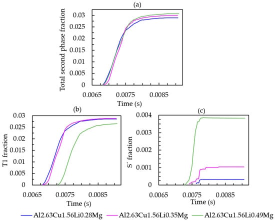 To further investigate the effect of Mg on the phase formation during solidification, different amounts of Mg were investigated (0.28 wt.%, 0.35 wt.%, and 0.49 wt.%). The overall amount of the second phase fraction increases slightly (see Figure 12a). It can be seen in Figure 12b,c that when the initial composition of magnesium increased from 0.28 wt.% to 0.35 wt.%, the amount of T1 remained constant at approximately 2.87% and T1 started to appear around the same time (at 0.00686 s) during solidification. The amount of the Sʹ phase for the alloy with 0.35 wt.% magnesium (represented by the pink line in Figure 12c) was 0.1%, which is greater than that for the alloy with 0.28 wt.% magnesium. When the magnesium content was further increased up to 0.49 wt.%, it had an adverse effect on the T1 precipitation with a decrease in the T1 solid fraction, while the Sʹ phase fraction increased. Moreover, the T1 precipitation was delayed by approximately 0.0004 s compared with the alloy with 0.28 wt.% and 0.48 wt.% magnesium.