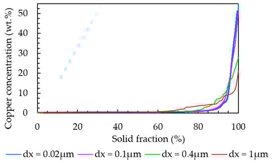 When comparing the results from the EDX point analysis and the segregation analysis from the phase-field simulation, it is observed that the amount of copper in the primary matrix and interdendritic region detected from the EDX point measurement was lower than that of the segregation analysis from the phase-field simulation. For instance, a maximum value of 14.3 wt.% of copper was detected in spectrum 7 in Table 4, while the copper concentration rose to 50 wt.% according to the results from phase-field simulation. We attribute this discrepancy to the limited spatial resolution of a “local” EDX point analysis. In the measurement, the concentration at a specific point is averaged over the volume where the electron beam generates the characteristic X-ray emission. For example, if the measured EDX point is focused on the interdendritic region with a higher concentration of segregated alloying elements, it will also include the FCC phase, which surrounds the interdendritic region due to the small length scale of the particle solidification microstructure. Therefore, the results from local EDX measurement are an average value over a larger volume than one captured by the results from the phase-field simulation determined by the grid spacing, which was 0.02µm in our case. It is also worth mentioning that in the phase-field simulations, concentration values were smeared over diffuse-interface regions. However, a single grid cell outside the interface has the “true” phase concentration. Hence, the effect of the diffuse interfaces can be seen in the steepness of the concentration distribution but not in the min/max values themselves (refer to Figure 7). To further confirm the explanation for the difference between EDX measurements and phase-field simulations, the simulated concentration field was mapped on different coarser grids. Figure 14 shows the sorted Cu concentration of the simulation results obtained for Al-2.63Cu-1.56Li plotted for different grid resolutions. It is evident that an evaluation on a coarser grid led to Cu concentrations that were closer to the local EDX measurement results.