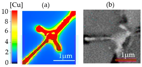 According to the results from EDX point analysis, the solute concentration of both Cu and Mg was higher in the interdendritic phases, as expected from the segregation analysis (Figure 7) during phase-field simulation. In spectra 7, 8, 9, 13, and 14, which are the points in the interdendritic regions, the measured values for Cu (in weight percent) were 14.3, 11.8, 8, 7, and 4.6, respectively. The values were comparatively higher than those measured in the primary dendritic FCC phase, whose values were represented by spectra 10, 11, and 12. Similarly, the segregation of Mg in the interdendritic phases was found to be higher compared with the FCC matrix phase.