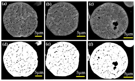 (a–c) Gas-atomized 20 µm Al-2.63Cu-1.56Li-0.28Mg powder in backscattered electron primary FCC phase (gray) and interdendritic phases (black); (d–f) Eutectic areas of Al-2.63Cu-1.56Li-0.28Mg powder by a threshold algorithm using ImageJ.