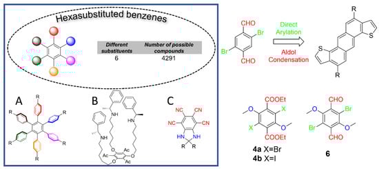 We first became interested in hexasubstituted benzene substrates bearing an o-dibromodialdehyde substitution pattern, and with electron-donating alkoxy substituents in the remaining positions of the aromatic scaffold to complete the hexasubstitution of the parent benzene scaffold, such as molecular target 6. In fact, our group developed a one-pot cascade process using ortho-bromoaldehyde substrates as starting materials, which involves direct arylation followed by an intramolecular cross-aldol condensation. This method has been proven to be a highly scalable and sustainable methodology for the annulation and rapid construction of conjugated compounds [20,21,22,23,24,25,26,27]. Some of these materials have been utilized for the construction of conjugated oligomers and polymers with outstanding sustainability and scalability characteristics for functional applications [28,29,30,31,32,33,34,35,36].