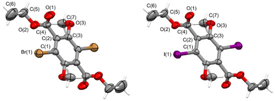 The crystallographic study shows that 4a and 4b compounds occurred as two isostructural crystals; plots showing the thermal ellipsoids are reported in Figure 2. The two molecular compounds had a perfect Ci symmetry because an inversion center was placed at the center of the aromatic ring and the asymmetric unit was only a half of the molecular compound.