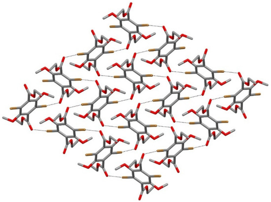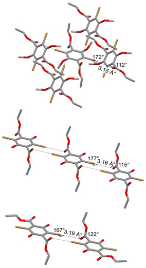 The same conformation for the ethyl-ester groups occurred in the form of compound diethyl 2,5-dibromo-3,6-dihydroxyterephthalate occurring in an ethanol solvate crystal [40], and in this case, each molecule of diethyl 2,5-dibromo-3,6-dihydroxyterephthalate was involved in four CAr-Br⋯Ocarbonyl XB interactions. However, in the ethanol solvate crystal of diethyl 2,5-dibromo-3,6-dihydroxyterephthalate, each molecular compound originated couples of XB interactions with two adjacent molecules (Figure 4 middle), leading to the formation of a supramolecular chain.