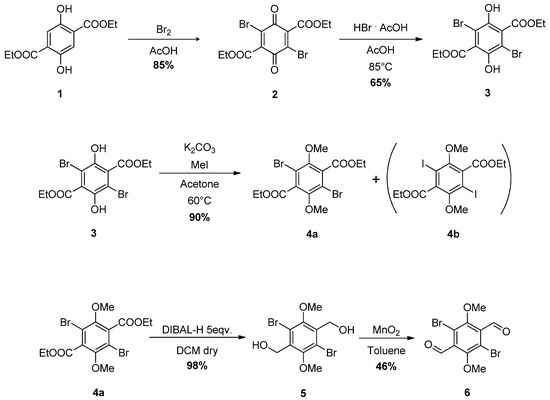 Our synthetic approach is shown in Scheme 1 and consists of five synthetic steps using unexpensive reagents. The first two steps led to hexasubstituted benzene 3 according to our modification of a literature protocol that requires a bromination of compound 1, to give tetrasubstituted-1,4-benzoquinone 2 in a high yield (85%), followed by its reduction with HBr (65% yield) [45]. Compound 3 was methylated using iodomethane in the presence of K2CO3 as a base in acetone, affording the new compound 4a with 90% yield. Surprisingly, when this reaction was conducted in high dilution conditions (ca. 0.01 mol·L−1 instead of 0.3 mol·L−1) the formation of a new product 4b, which was easy to separate from 4a by flash-chromatography, was observed in a low yield. The low substrate concentration seemed to promote the partial substitution of bromine by the iodine atom of the methylating reagent, confirming the tendence of these compounds to react in nucleophilic aromatic substitution reactions [46]. In both the case of 4a and 4b, 13C NMR carbon resonances fall in the region of substituted benzenes, demonstrating that, even in the presence, such as in this case, of electron withdrawing and electron donating substituents, the aromaticity of the system is not substantially perturbed, with no quinoidal behavior associated to such compounds. NMR spectroscopy, single crystal XRD, and mass spectrometry analysis of compound 4b confirm a structure with iodine atoms instead of bromine atoms. When trying to obtain 6, the direct reduction with DIBAL starting from diester 4a or 4b failed, as well as our attempts to reduce 4a or 4b to dialcohol 5 with LiAlH4, as the aromatic dehalogenation took place concomitantly. Compound 4a was then successfully reduced to alcohol 5 using an excess of DIBAL-H. Finally, compound 6 was oxidated with manganese dioxide to give dialdehyde 6.