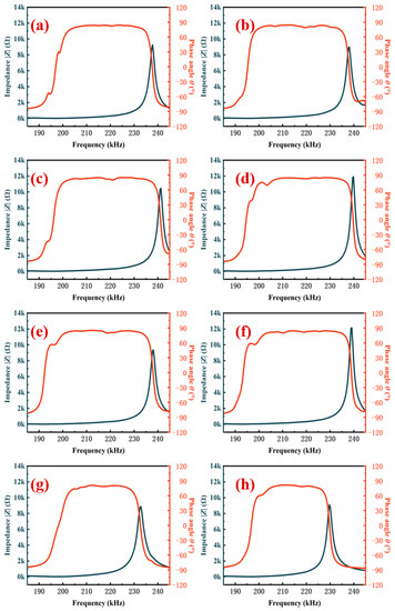 The physical parameters of the studied ceramic samples, including kp, Qm, d33, d33*, Ec, and Pr, are summarized in Table 2. The piezoceramics sintered at 980 °C have the optimal piezoelectric characteristics with a d33 of 701 pC/N and a kp of 66.7%. Qm values of all the samples remain constant at about 70, independent of sintering temperatures. Lead vacancies which are widely thought will result in low Qm, making the ceramics “soft”. Lead vacancies are propitious to domain switching. Thus, soft piezoelectric ceramics feature quick response speed, high piezoelectric constant, and low mechanical quality factor value. As reported, it is hard to ensure that the ceramics sintered at low temperatures have a high Qm [41]. At low sintering temperatures, the effect of temperature on lead/oxygen vacancies is far less than that of doping [42]. This should be responsible for the temperature independence for Qm. The impedance plots are shown in Figure 4.