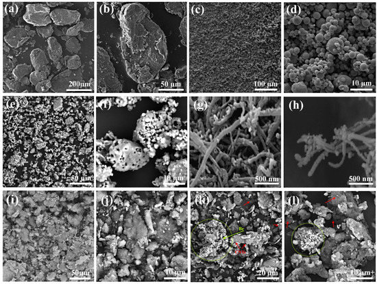 The SEM micrographs in Figure 2 show the morphology of pure powders related to (a,b) Mg, (c,d) Zn, (e,f) bredigite, and (g,h) CNTs that have not yet been subjected to mechanical or chemical stress. For milling and mechanical alloying, 97 wt% and 3 wt% of pure Mg and Zn powder were added to the grinding chamber. Powder particles are constantly subjected to expansion, cold welding, fracture and re-welding during high-energy milling. The result of this process is the formation of alloy powders (MZ) with new surfaces that are the result of the fusion and penetration of particles into each other and the creation of larger particles (Figure 2i,j). Figure 2k,l also show Mg-based composite powders (MZ/Br-CNTs) that were produced by adding bio-ceramic reinforcements of bredigite and CNTs by SPM method, as indicated by arrows.