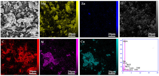 According to Figure 3, SEM images and EDS map spectra confirm that the composite powder contains Mg, Zn, O, C, Si and Ca. A dense overlapping mass of Ca and Si is clearly visible, indicating the presence of a bioceramic reinforced bredigite (Ca7MgSi4O16) bound to a Ca-containing magnesium silicate compound. Although the amount of CNTs is small, they are evenly distributed in the Mg field and can be seen as a reinforcing material.