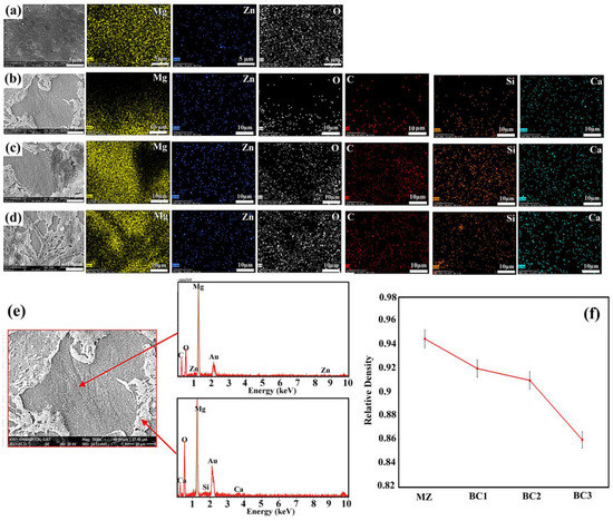 SEM and map images (a) MZ ×7000, (b) BC1 ×3500, (c) BC2 ×3500, (d) BC3 ×3500, (e) SEM and point EDS analysis of BC1 composite, (f) Relative density curve for samples after SPS process.