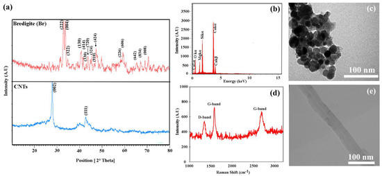 (a) XRD pattern for bredigite, CNTs, (b) EDS spectrum of bredigite, (c) TEM image of bredigite, (d) Raman spectrum of pure CNTs, and (e) TEM image of CNTs.