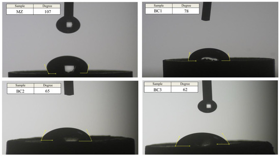 According to Figure 6, the contact angle of a drop of liquid with the bulk surface for MZ, BC1, BC2 and BC3 samples is 107, 78, 65 and 62 degrees, respectively. The presence of Br-CNTs reinforcing particles in the background phase reduces the contact angle of water due to their hydrophilic properties, and since silicate bioceramics are hydrolyzed in physiological environments, this results in increased water absorption [5,6]. On the other hand, the presence of carbon elements causes the creation of functional groups including carboxyl (COOH), carbonyl (C=O) and hydroxyl (O-H), which lead to hydrophilicity. As the biocompatibility of Mg-based implants improves, the hydrophilicity also improves [7].