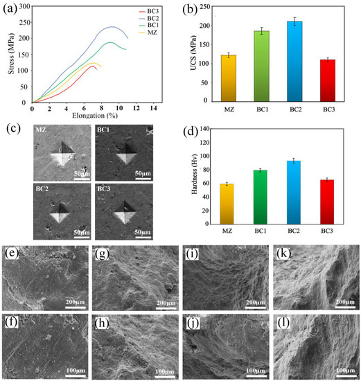 (a) Compressive curves (b) ultimate compressive strength (UCS) diagram, (c) surface morphology after deformation by press indentation ((d) the value of microhardness, (c–j) SEM images of the fracture surface of the composites after the compressive strength test: (e) MZ ×150; (f) MZ ×300; (g) BC1 ×150; (h) BC1 ×300; (i) BC2 ×150; (j) BC2 ×300; (k) BC3 ×150; (l) BC3 ×300.