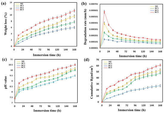 Graphs of (a) weight loss, (b) degradation rate, (c) pH values and (d) H2 values associated with various composites subjected to immersion test.
