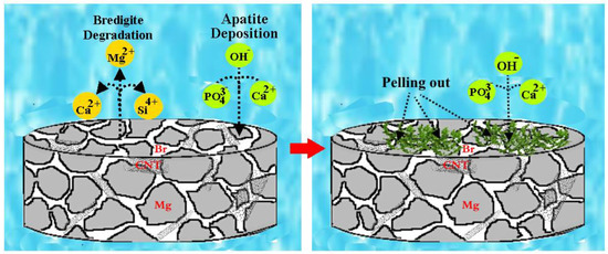 In addition, deposition of apatite in the Mg matrix can be facilitated by oxygen-rich groups in carbon materials such as CNTs. This is because the carbonaceous material provides a useful site for the nucleation of hydroxyapatite, which can lead to the formation of a dense apatite layer and thus can prevent further penetration of SBF [29]. Moreover, previous studies have shown that CNTs can act as bridges when used as composite reinforcements due to their thread-like appearance [30], and prevent the oxide layer from peeling off the alloy, which in turn can improve corrosion resistance [30,31,32].