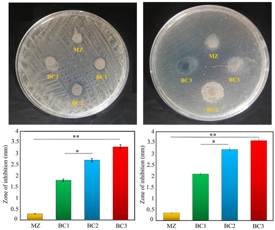 As is evident from Figure 12, bacterial growth continues around the MZ samples, but stops around all nanocomposites containing Br-CNT. In addition, it can be seen that near BC3 on the agar plate there is a wider inhibition zone compared to the halo zone, which has not grown near BC1 after 24 h. In other words, increasing Br-CNT increased the inhibition zone or growth halo of the composite. Thus, the bacterial inhibition zones for Escherichia coli and Staphylococcus aureus ranged from 0.25 to 3.3 mm and 0.36 to 3.6 mm, respectively.
