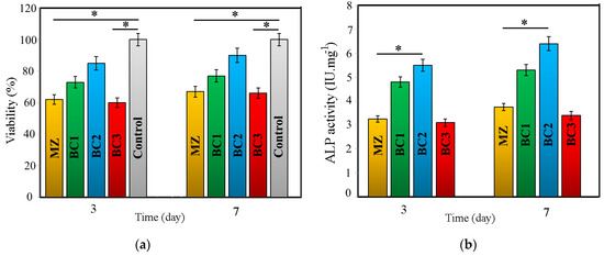 (a) Cell viability and (b) ALP activity for different composites (* p ≤ 0.05).