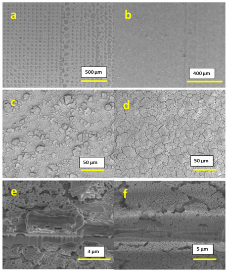 SEM images: (a,c) surface image of 0.4 M conc. 1-layer film; (b,d) surface image of 0.4 M conc. 10-layer film; (e) cross-section of 0.4 M conc. 1-layer film; (f) cross-section of 0.6 M conc. 10-layer film.