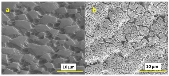 We can also affect the microstructure by using high boiling point solvents and surfactants. In the present work, we used Et:Etg (50:50) solvent as a high boiling solvent and triton-X as a surfactant in combination with IPE. We have observed different microstructures for both cases, as shown in Figure 5. For both of the films based on Et:Etg and triton-X with IPE solvents, after printing one layer, the surface showed a substantial amount of flaking, as shown in Figure 5a,b; however, after the deposition of ten layers, as shown in Figure 5c,d the films appeared consolidated. Cross-section analysis (shown in Figure 5e,f) did not reveal substrate adhesion issues. However, in the case of the films based on Et:Etg inks, somewhat larger pores at the substrate interface, and thus smaller attachment areas, were observed.
