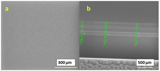 Furthermore, we studied films for a 0.4 M IPE-based solution printed at a 60 °C temperature and subsequently annealed at 400 °C. We observed that the surface of the obtained films was continuous, dense, smooth and homogeneous, as shown in Figure 7a. However, the thickness of a single-layer printed film was in the range of 130–145 nm, as shown in Figure 7b, and was comparatively thinner than that of the 300 °C printed films. The films did not contain any cracks or flaking. Such films can be suitable for applications that require dense films.