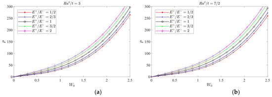 According to Equation (62) and Table 4, the curves of P-W0 under different λ = Ra/b values (1/2, 1 and 2), different E+/E− values (1/2, 2/3, 1, 3/2 and 2) and different Ra2/t values (ranging from 3 to 11/2, with the interval 1/2) may be plotted, as shown in Figure 11, Figure 12 and Figure 13, in which Figure 11 shows the case of λ = 1/2, and Figure 12 shows the case of λ = 1, and Figure 13 shows the case of λ = 2.