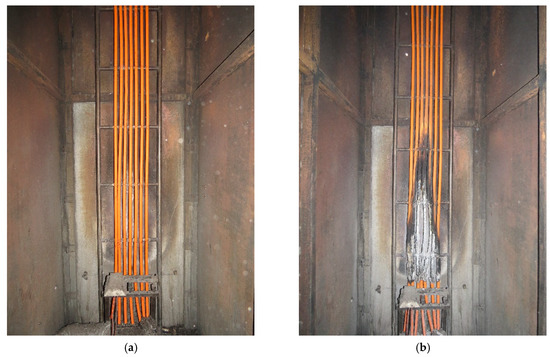Figure 3. Cable sample No 3 installed on the test ladder: (a) before the test, (b) after the test.