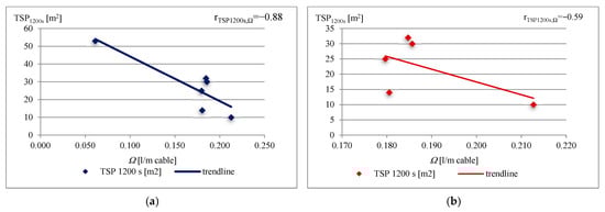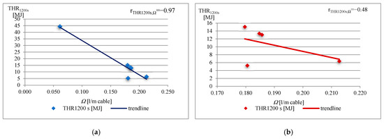 The values of the linear correlation coefficient r for THR1200s and TSP1200s observed are close to −1 (rTHR1200s,Ω = −0.97 and rTSP1200s,Ω = −0.88) (Figure 4a and Figure 5a), which demonstrates that there is a (negative) linear relationship between them and the volume of effective non-combustible content Ω, namely the number of cables, metallic flame barriers (conductor barriers), and combustible non-metallic components of cables.
