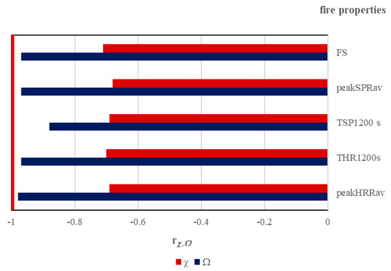 As mentioned, the THR1200s and TSP1200s strongly depend on combustible material content. Absolute values of Spearman’s correlation factors for both fire properties as a function of the Ω cable parameter increase with the number of cables for testing (Figure 4 and Figure 5). However, there is a disturbance in the correlation, in that that the lowest value of the Ω cable parameter (Ω = 0.061 L/m cable) was obtained for a cable consisting of one copper conductor, without any bedding, and thus a low amount of combustible non-metallic content (sample No 1). These differences in the construction of the one-conductor cable cause a low linear correlation coefficient r (rTHR1200s,Ω = −0.48 and rTSP1200s,Ω = −0.59) (Figure 4b and Figure 5b).