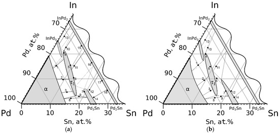 Palladium-rich areas of isothermal sections of the In–Pd–Sn system at 500 °C and 800 °C, built according to the data from Table 2 and Table 3, are shown in Figure 1. Both are very similar, with only small differences in the solubility of the third components in InPd3 and Pd3Sn compounds.