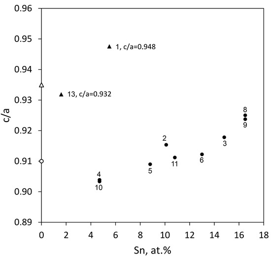 Note that the crystal structures of both the InPd3 and τ1 phases as identified from the powder patterns appearing as disordered In-type structures. Since the atoms of indium, tin, and palladium have very similar values of atomic X-ray scattering factors [24], superstructure reflections intensity was essentially zero. For this reason, to determine the crystal structure of In-type tetragonal phases in samples 1–6, 8–11, and 13, we used an approach similar to that described in [20,21]. This approach is based on the results of [8,9,25], who found that in the In–Pd binary system, the low-temperature modification of InPd3 (Al3Ti-structure) and the high-temperature modification of the InPd3 compound (Al3Zr-structure) differ in the ratio of c/a parameters for their face-centered pseudocubic subcells. The c/a ratio equal to 0.935 corresponded to the Al3Zr-type structure, and the c/a equal to 0.91 corresponded to the Al3Ti-type structure.