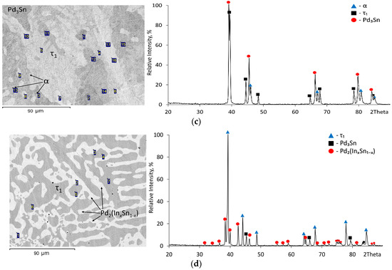 BSE images and XRD patterns of the In–Pd–Sn alloys annealed at 800 °C: (a) No. 1, (b) No. 10, (c) No. 9, (d) No. 11; the numbers indicate the points of measurement of the composition.