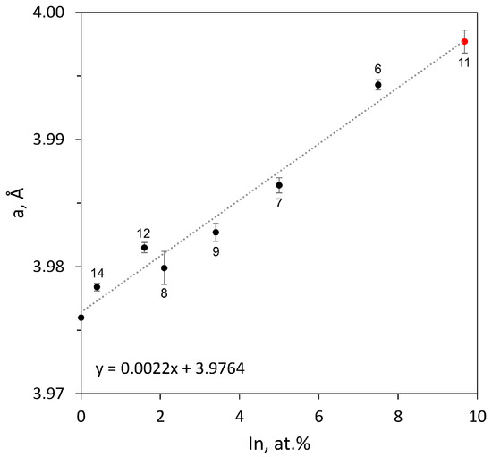 The homogeneity field of the Pd3Sn phase at 800 °C was determined by the XRD method for the two-phased samples 6, 12, and 14 and the three-phased samples 8, 9, and 11 (Table 2). The maximum solubility of indium in the Pd3Sn phase was determined in the study of Sample 11 s. According to the XRD, the sample relates to the three-phase equilibrium of Pd2(InxSn1−x) + Pd3Sn + τ1 (Figure 3d). However, EDX was unable to determine the composition of Pd3Sn. Therefore, the solubility of indium in the Pd3Sn phase was found from dependence of the lattice spacing of that phase on In content (Figure 4). It is close to ∼10 at.%.